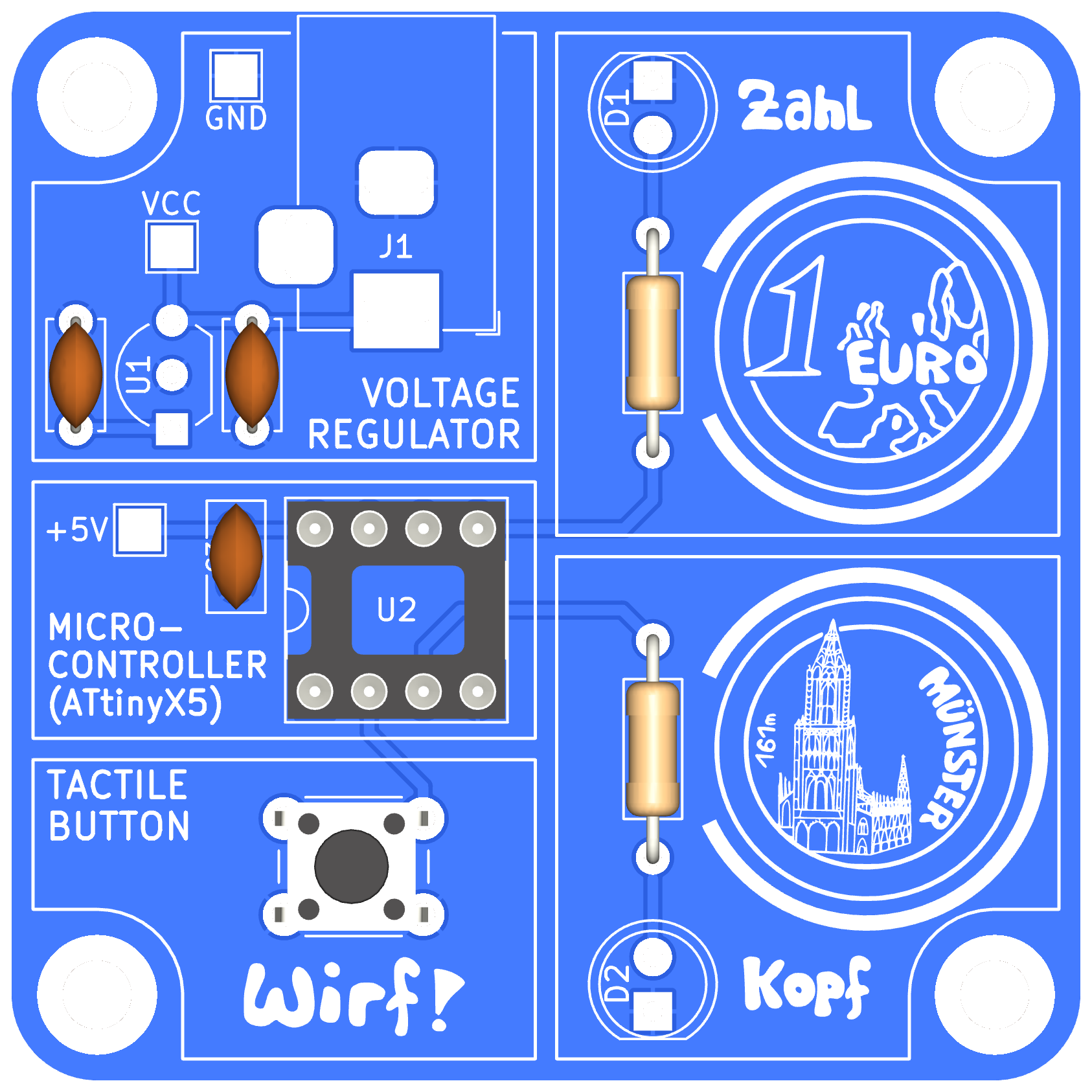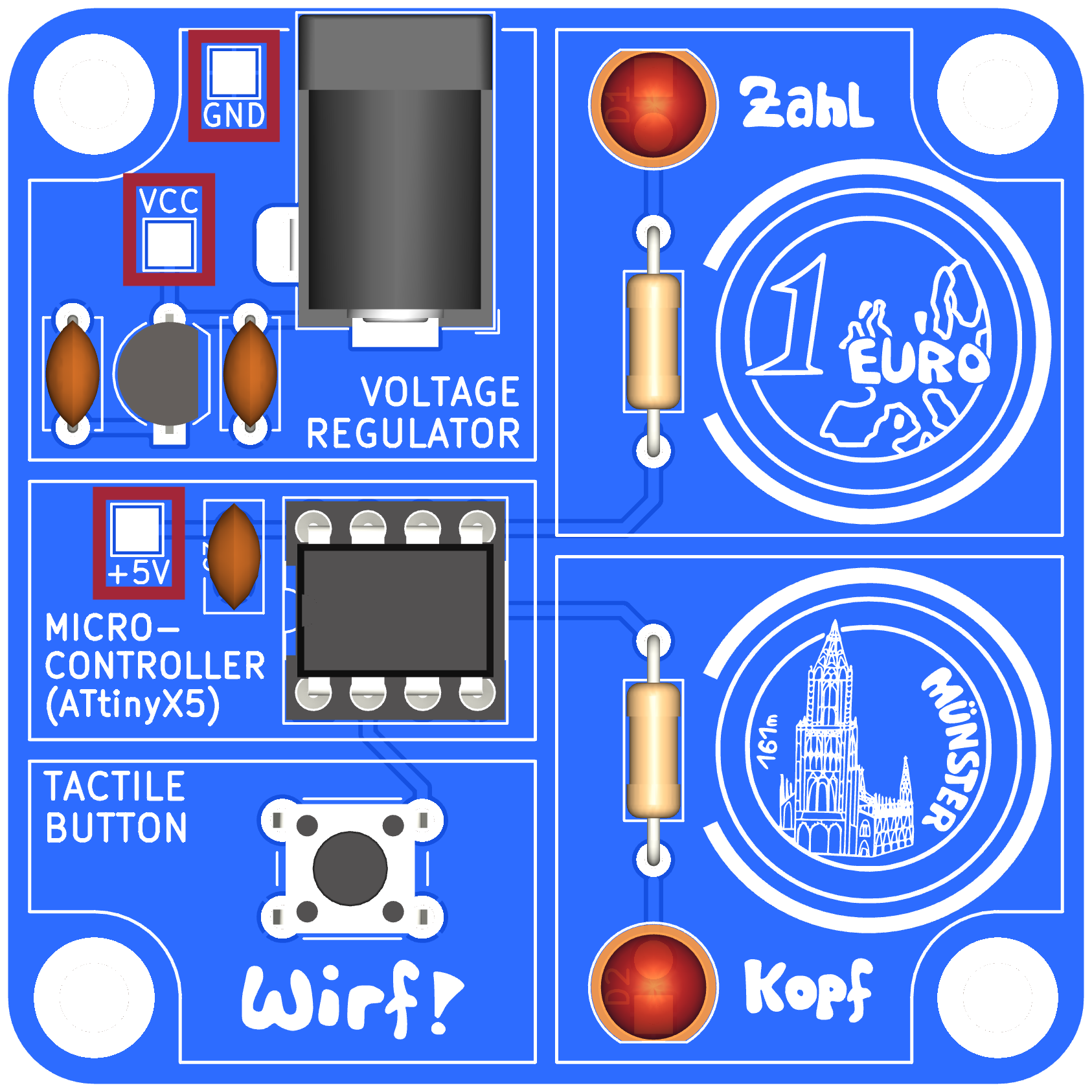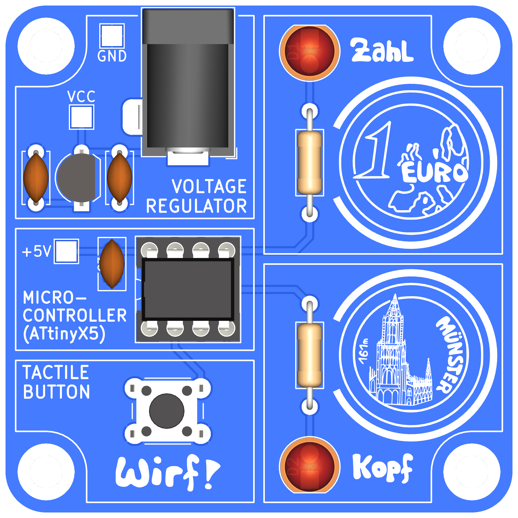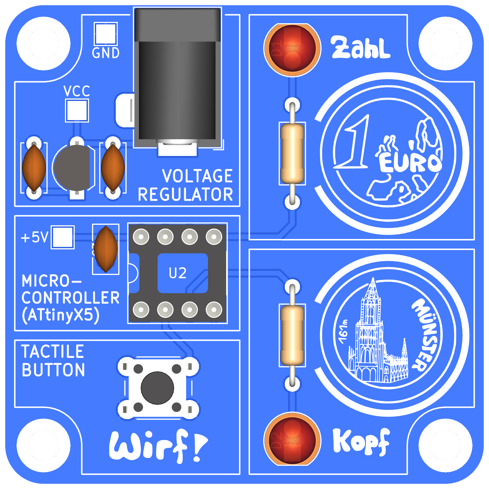 In diesem Bausatz habt ihr ebenfalls die Möglichkeit, eine Münze zu werfen und erhaltet als Ergebnis entweder "Kopf" oder "Zahl". Diese Ergebnisse werden jeweils durch eine Leuchtdiode dargestellt.
