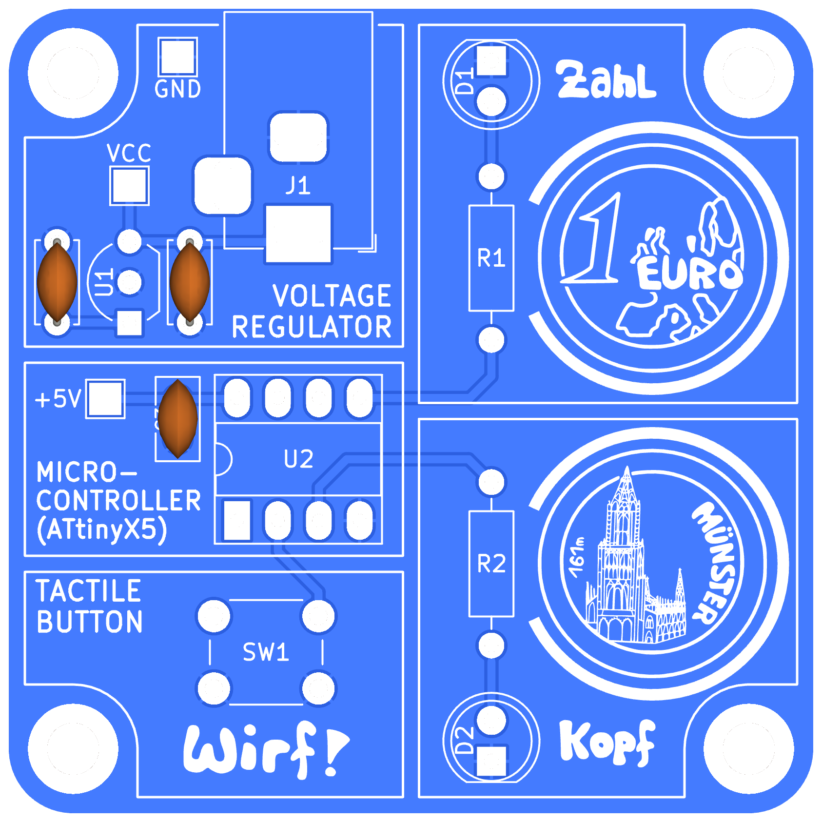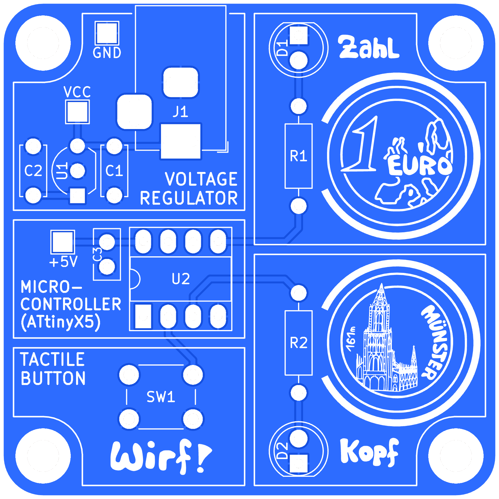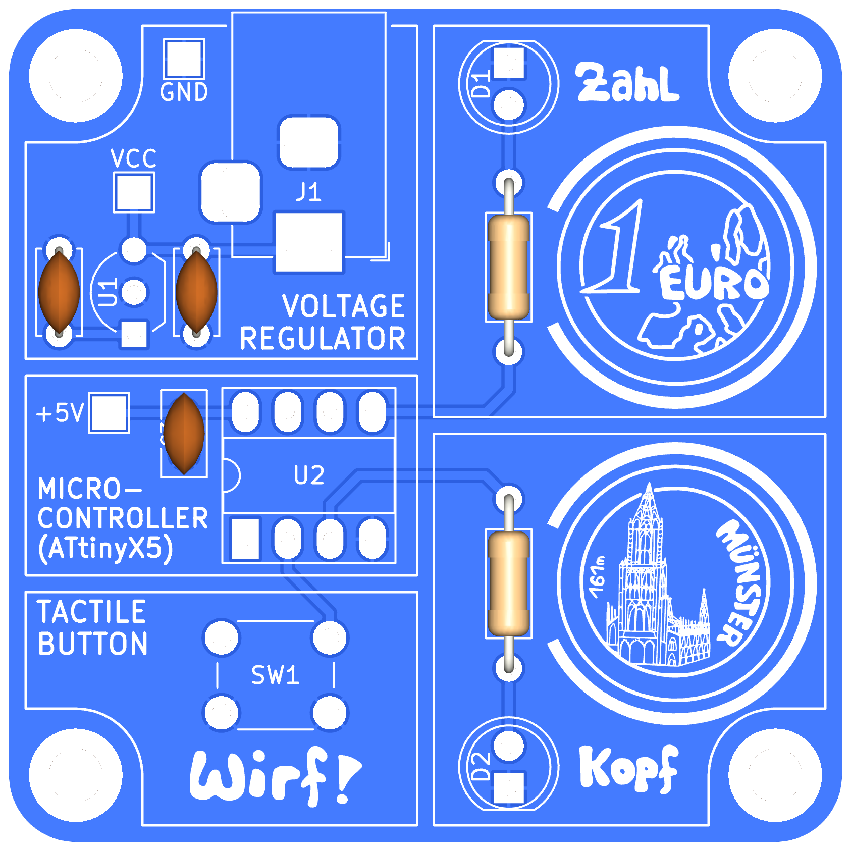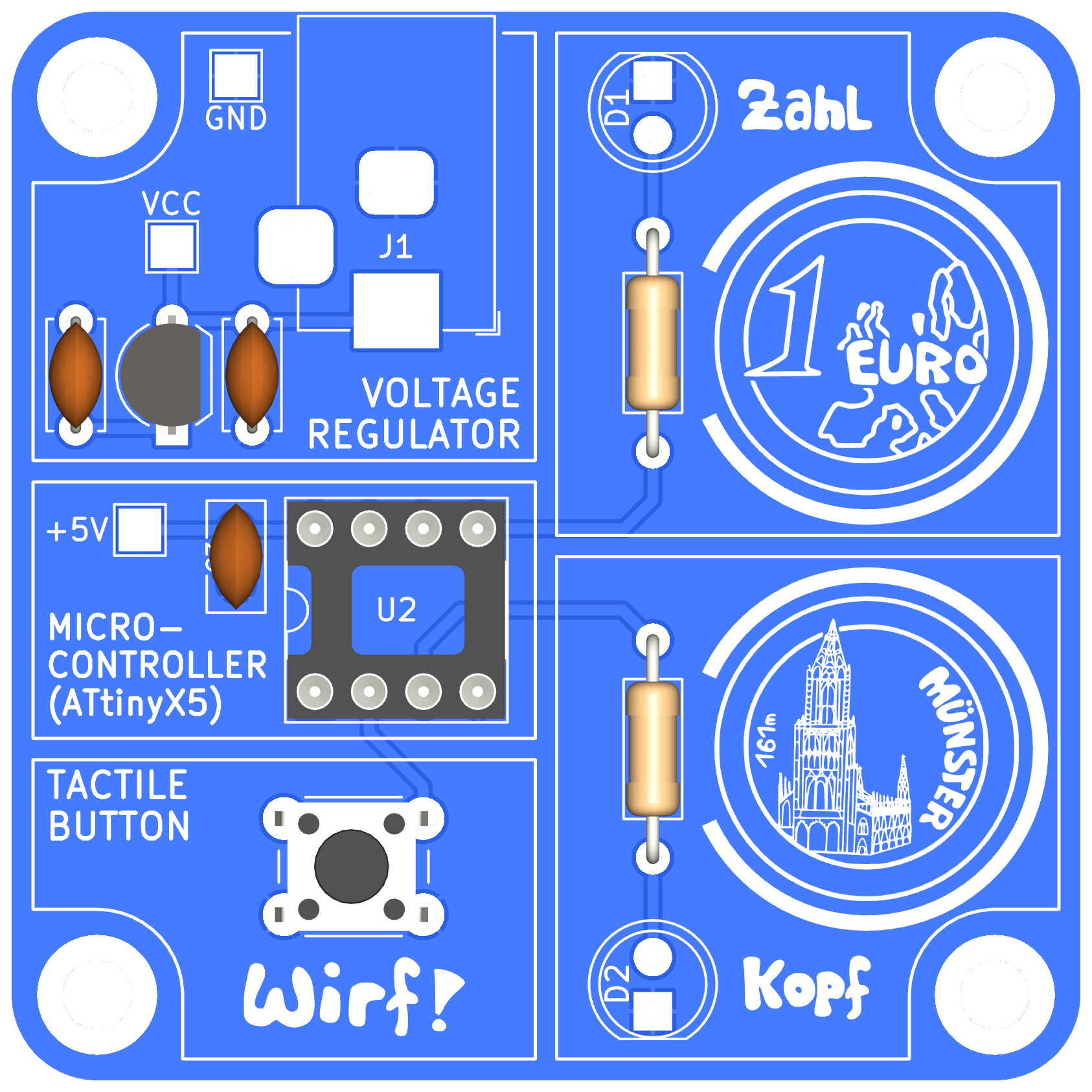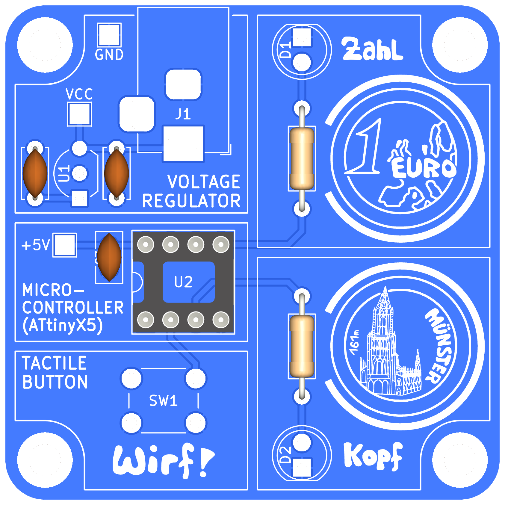 In diesem Bausatz habt ihr ebenfalls die Möglichkeit, eine Münze zu werfen und erhaltet als Ergebnis entweder "Kopf" oder "Zahl". Diese Ergebnisse werden jeweils durch eine Leuchtdiode dargestellt.
