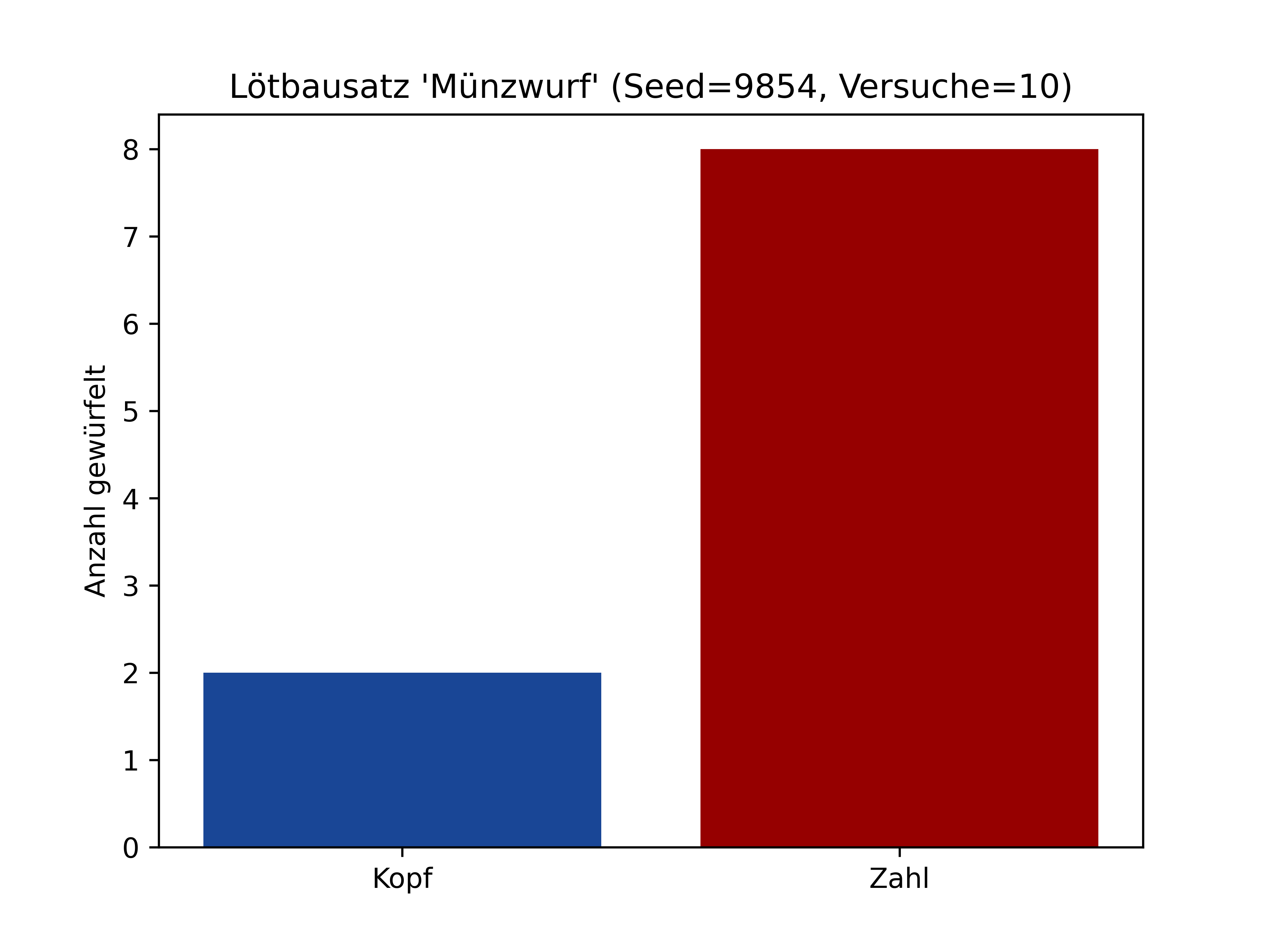 Anders als beim letzten Experiment entsprechen die Wahrscheinlichkeiten hier bei 10 Würfen bereits etwa dem erwarteten Ergebnis. "Kopf" tritt 6 mal ein, "Zahl" ereignet sich 4 mal.