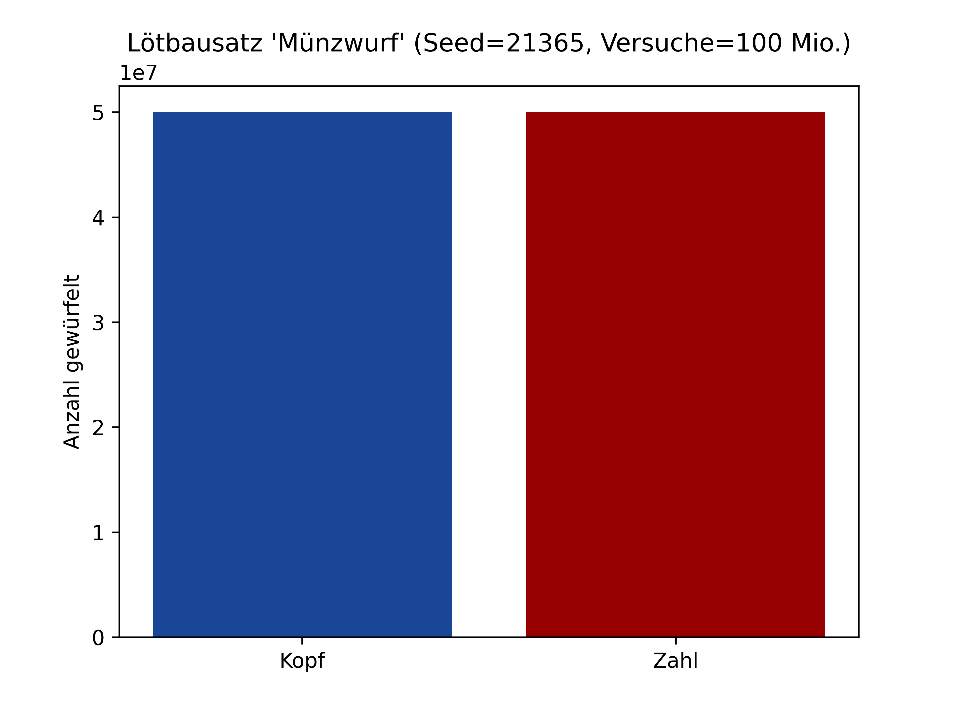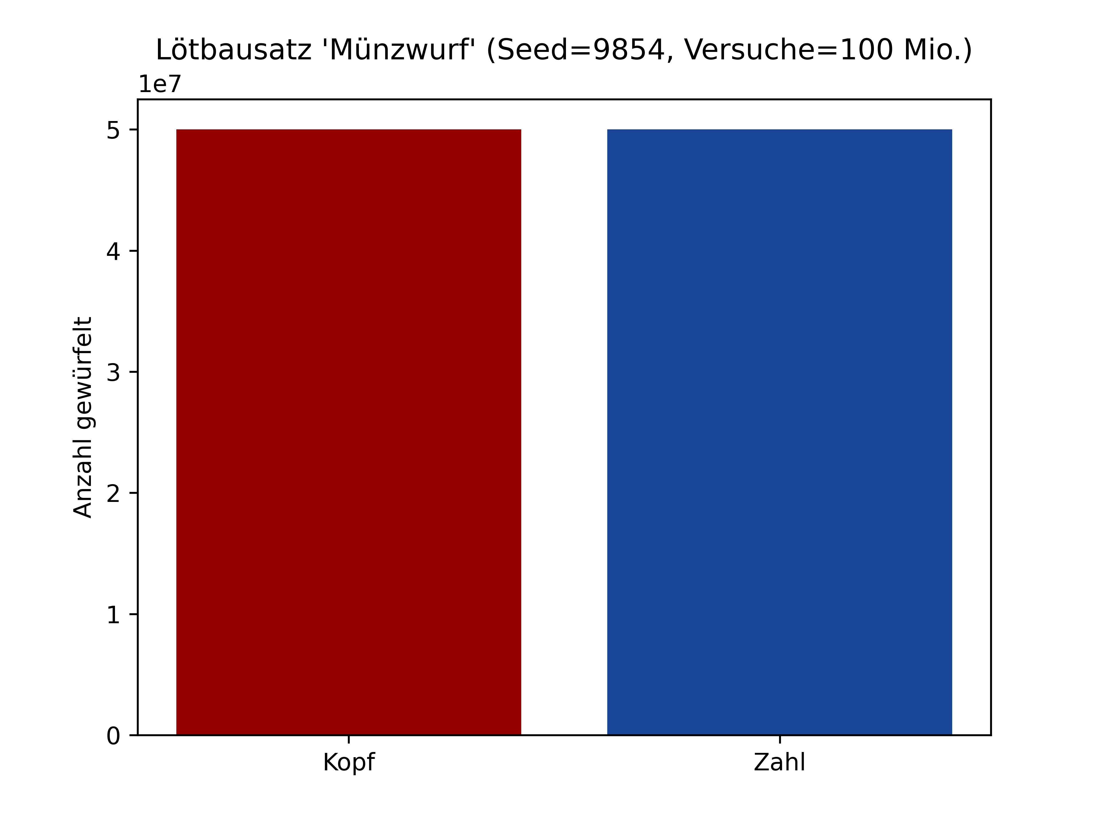 Auch hier zeigt die größere Messreihe wieder eine Gleichverteilung. Das Ereignis "Zahl" tritt etwas häufiger ein. Dies ist jedoch ein nicht-signifikanter Fehler. Die Wahrscheinlichkeit für beide Ereignisse liegt bei etwa 50%.