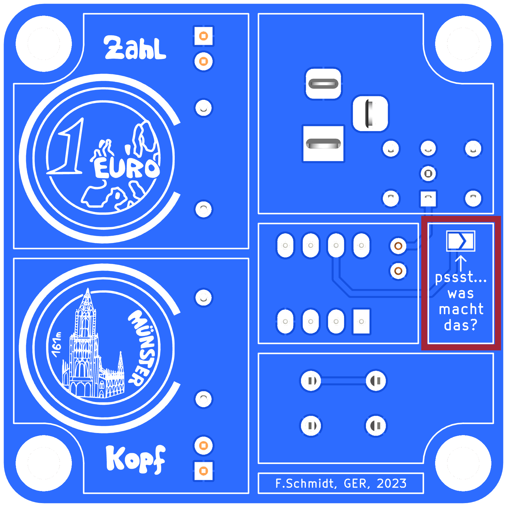 Auf der Unterseite findest du zwei kleine Lötanschlüsse mit der Beschriftung "pssst, was macht das?". Bitte stecke die Batterie ab und verbinde diese zwei Lötstellen miteinander. Du kannst mithilfe eines Multimeters überprüfen, ob die Stellen einen elektrischen Kontakt haben. Führe anschließend einige male den Münzwurf durch. Welche Veränderung beobachtest du?